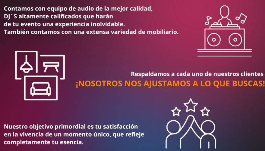 Somos una empresa innovadora, única y diferente dedicada al diseño y prestación de servicios para eventos sociales, empresariales y culturales, aportando en cada
